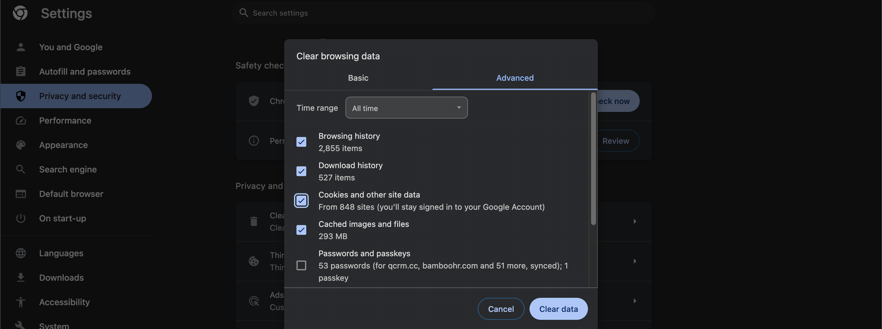Set time range to All time and make sure to check the next options: Browsing history, Cookies and other site data, Cached images and files.