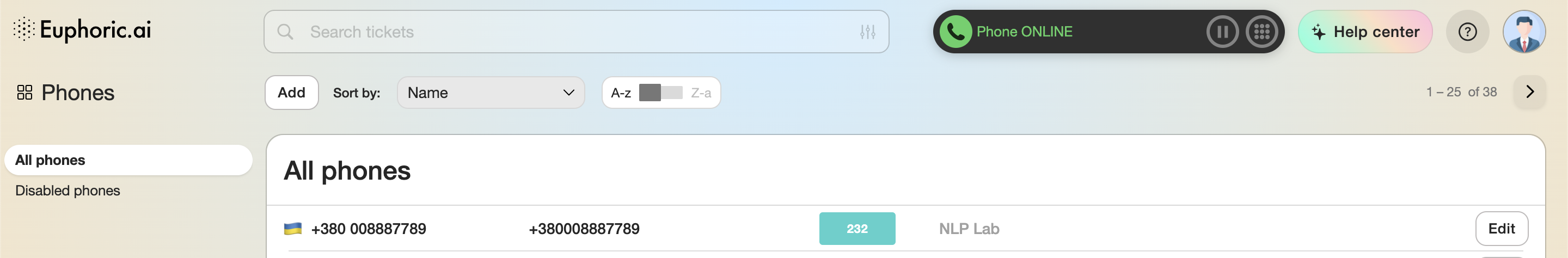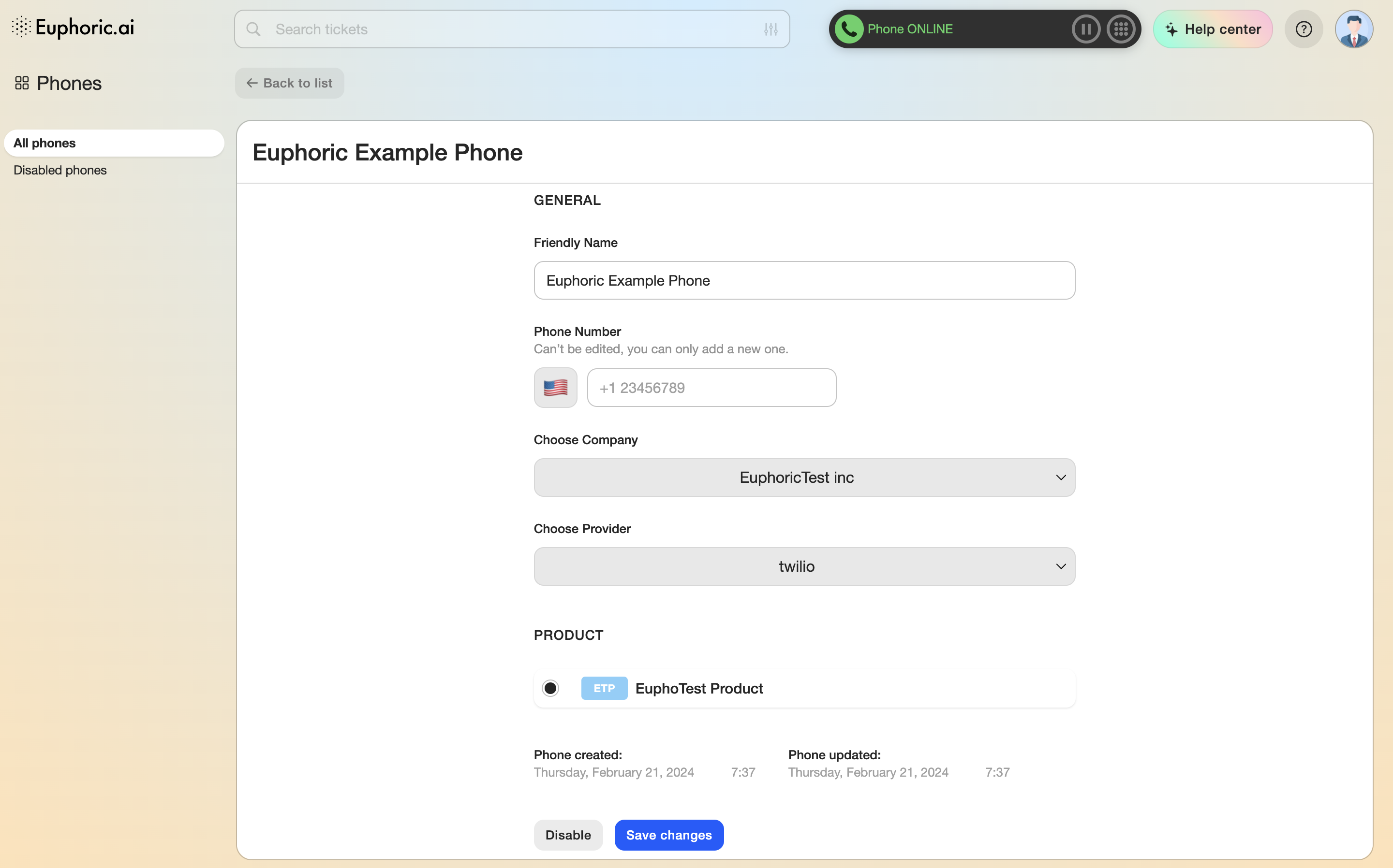 The Save and Disable buttons can be found at the end of the list. A disabled number is transferred to the disabled phones list.