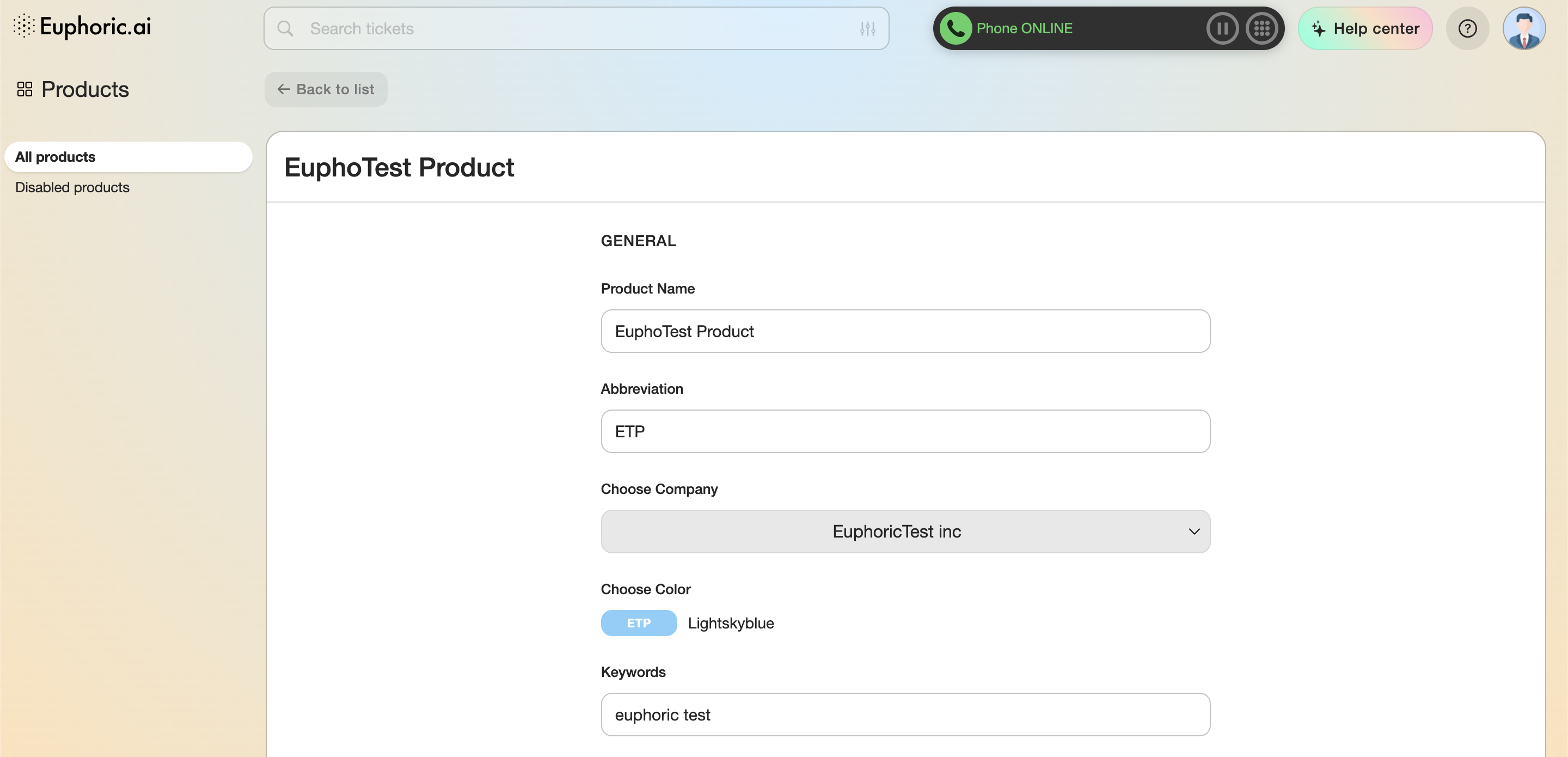 By clicking the full name of the product, the agent with the leader's role can get access to most of the ticket automation settings.