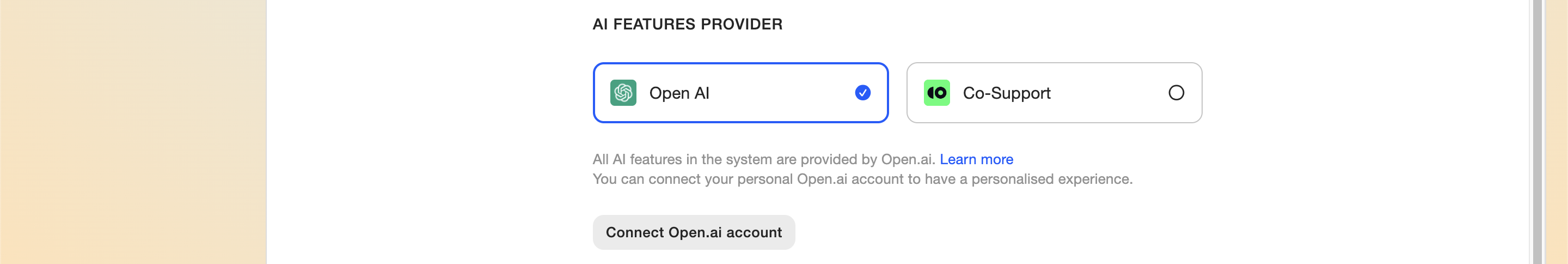 Currently you can switch between two AI features providers: Open AI, integrating it via its API, or built-in Co-Support.