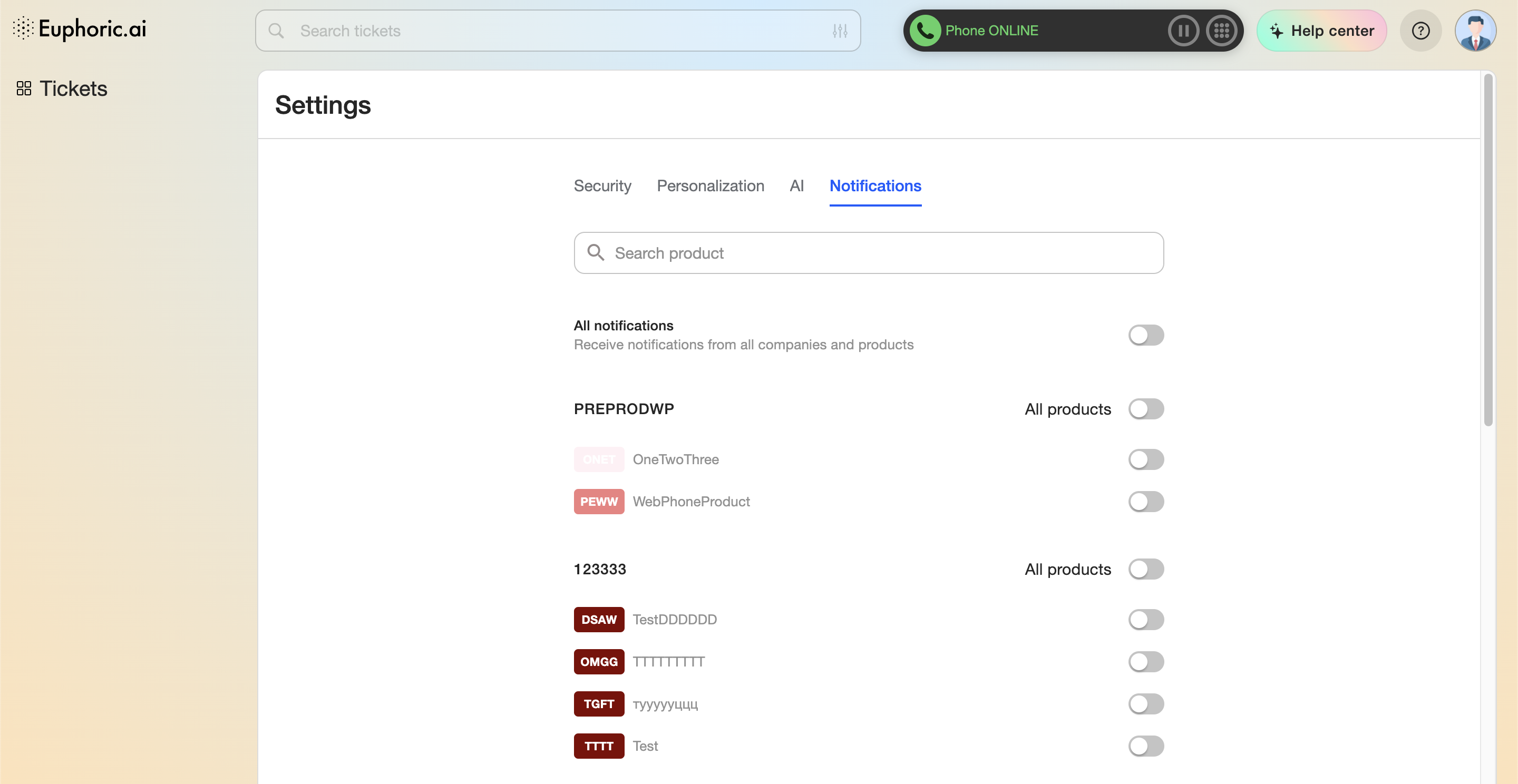 Notifications settings allow to turn on or off notifications for separate products, you have access to.