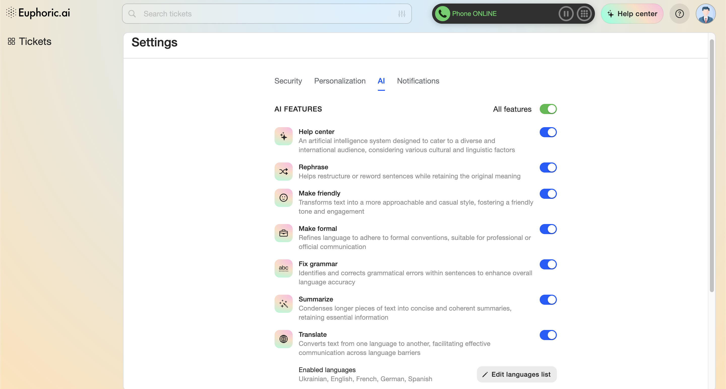 Euphoric Settings are divided by 4 main sections: Security, Personalization, AI and Notifications.