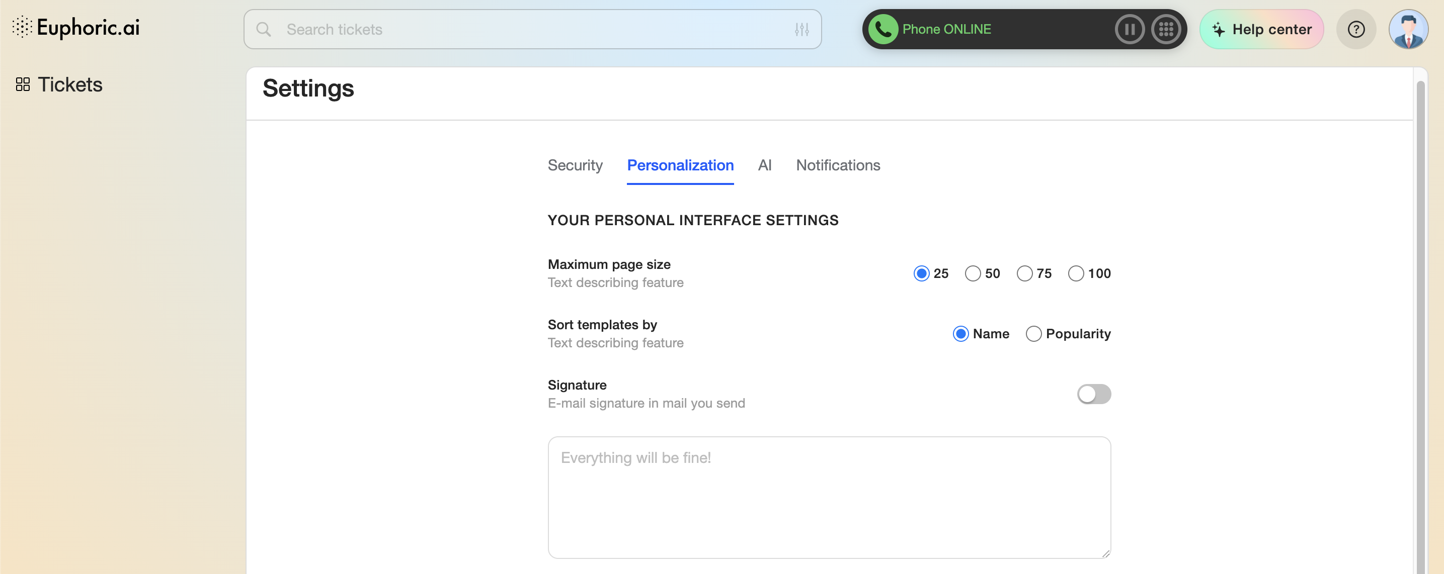 You can reach the Euphoric settings from the left menu by clicking on the Tickets button.