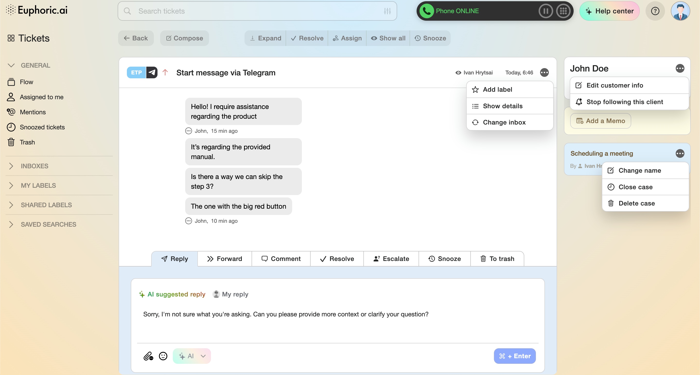 1. You can create a label by clicking on the three vertical dots, next to the agent's name who did a last interaction with the ticket (section 2).