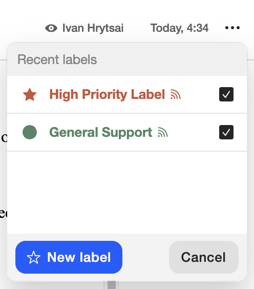 Labels help to sort tickets, uniting them in custom groups. Also, an important thing to note – you can automatically share your the labeled group of tickets with your whole team, or leave your label private, only visible to yourself. You can find all created labels in the left menu under the dedicated drop-down list heading My labels and Shared labels. You can edit the list of labels and saved searches by hovering your cursor over the list heading and clicking on the settings icon. More info about the right and left menu is described in the article Interface overview.