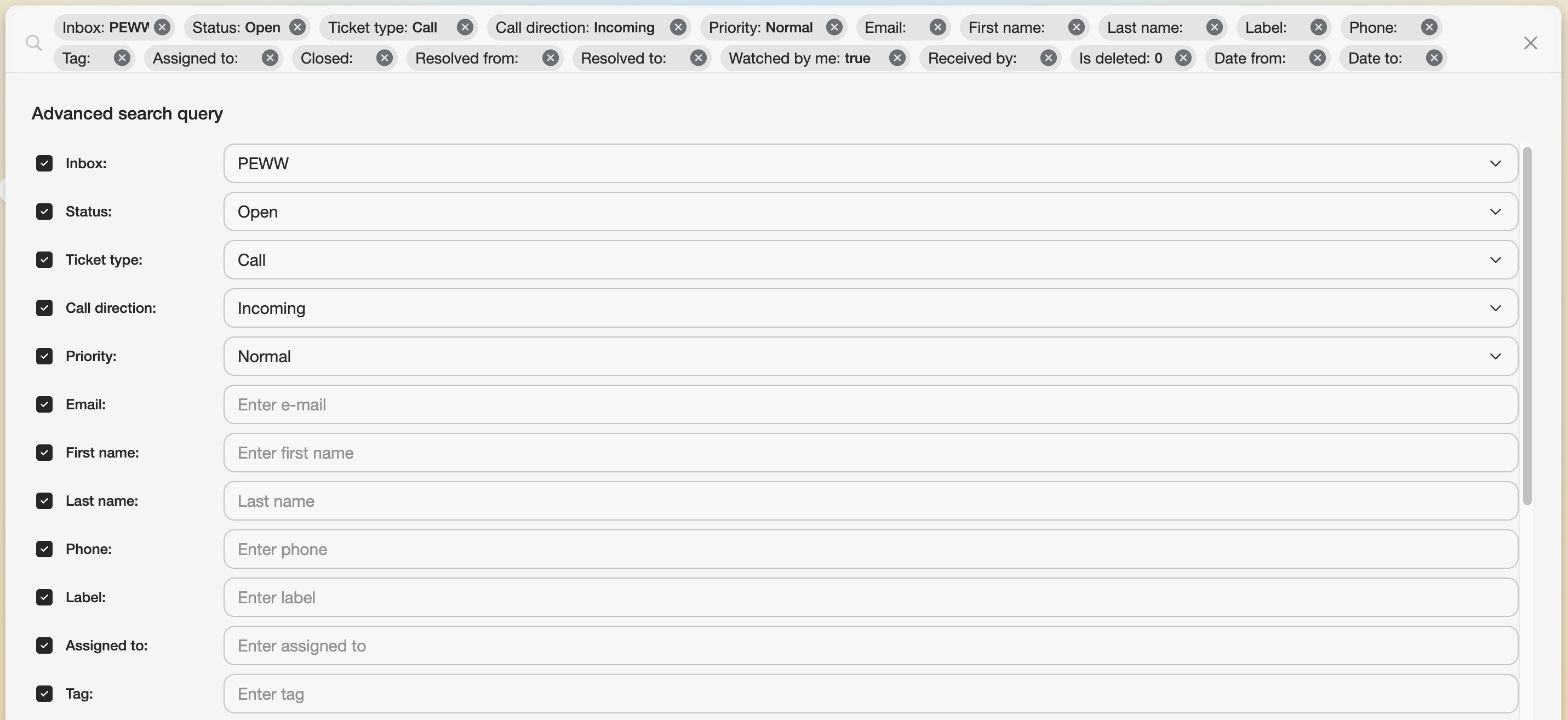 To access a filtered group of tickets fast, any search query can be saved into the Saved searches drop-down list on the left side of the interface.