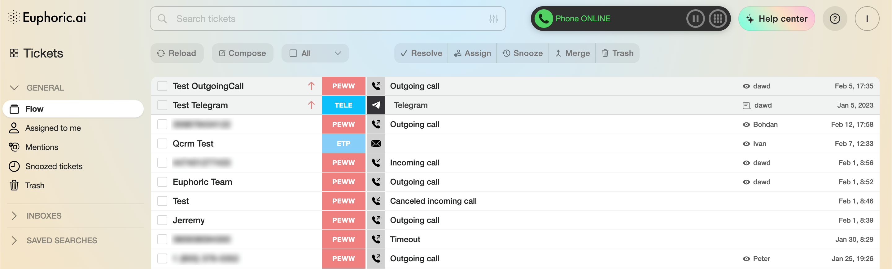 A single Euphoric ticket may contain all 3 ticket types within a particular customer profile. The different types of tickets will merge automatically, should the customer profiles contain identical phone numbers. Also, you can always merge them manually.