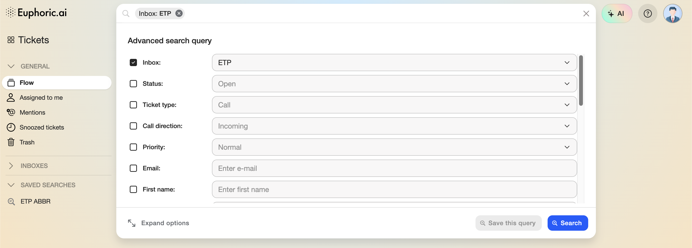 First, you'll need to open the search bar filters menu by clicking on the settings icon in the right corner of the Euphoric search field. Then a search query should be formed by selecting at least one filter. Then press Save this query button.